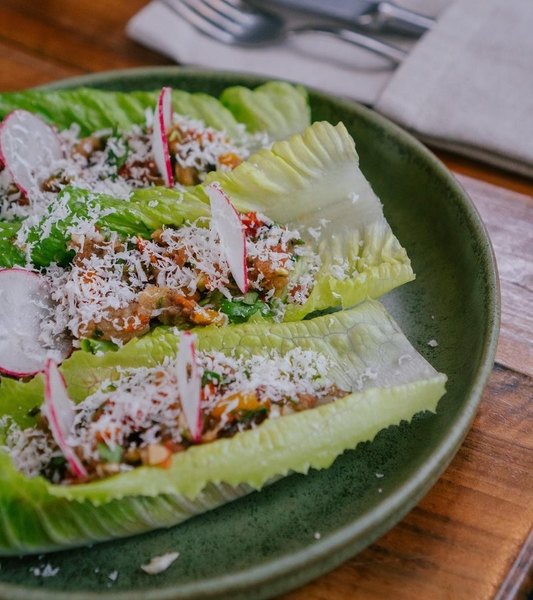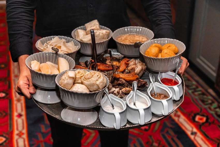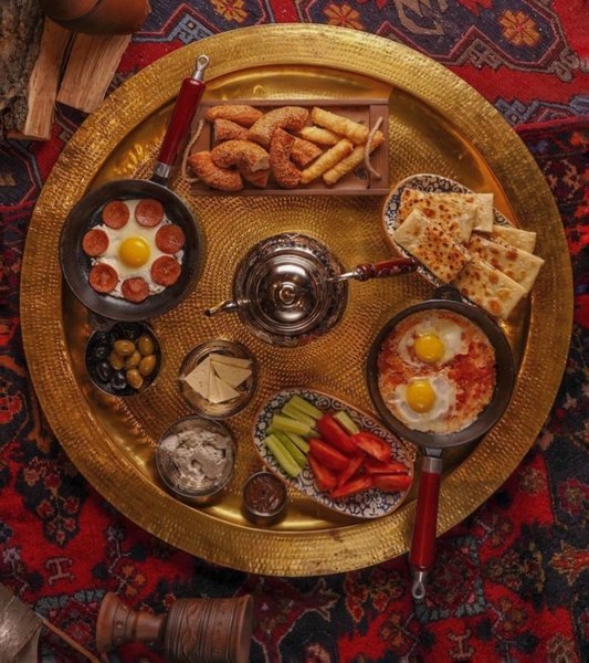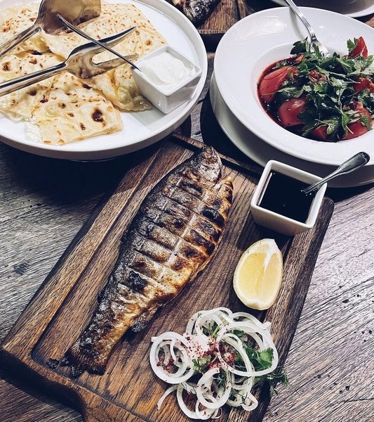 Здесь можно попробовать как национальные блюда, аварский хинкал (не путать с хинкали), яичное курзе или блюда, приготовленные в печи, например. Если хочется чего-то знакомого, можно заказать переосмысленный салат Цезарь в горских традициях. Все ингредиенты — романо, соус «Цезарь», кусочки курицы, помидоры и пармезан уложены внутрь лепёшки пита. А кофе готовят по‑восточному, на раскаленном песке в медной джезве, сохраняющей кофейный аромат.